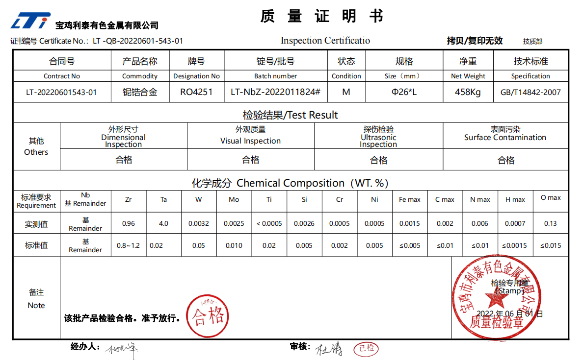 鈮鋯合金執(zhí)行標準:GB/T14842-2007 、YS/T656-2015