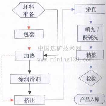 鈦是一種高活性金屬,不僅在空氣中加熱極易污染,而且在一定的溫度、壓力和表面狀態(tài)下具有和模具粘結的特性。鈦的導熱性差,熱擠壓時坯料表層與中心易產生較大溫差,促使金屬流動不均勻性加劇,這樣表面層就產生較大的附加拉應力,在制品表面易形成裂紋。嚴重時,在擠壓棒材及管材上可能產生大的中心擠壓縮孔。同時,擠壓鈦及鈦合金時熱效應顯著,不合適的擠壓工藝對擠壓品組織和性能有副作用。鈦的彈性模量低,回彈嚴重,成型困難。因此鈦合金擠壓變形過程比鋁合金、銅合金等其它有色金屬擠壓變形過程更為復雜。鈦材熱擠壓工藝過程根據坯料是否包套有所區(qū)別,其主要工藝流程如圖2所示。鈦材熱擠壓技術發(fā)展至今,中外相關技術人員圍繞提高鈦擠壓材質量和成材率、降低生產成本在坯料制備、坯料加熱溫度、擠壓比、擠壓速度、潤滑及擠壓模具等方面做了大量研究探索工作。