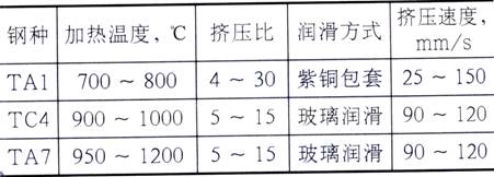 需要指出的是,鈦及鈦合金優(yōu)質產品的擠壓,要求在保持工具有滿意壽命的條件下制定正確的生產工藝,即要求溫度、擠壓速度、擠壓比及潤滑方式的配合。上表列舉了典型鋼種擠壓棒材的參數(shù)。