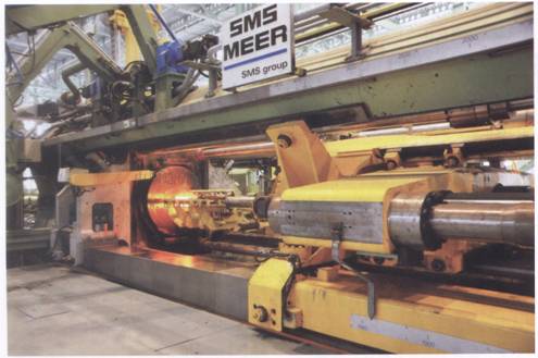 我國鈦及鈦合金擠壓生產開始于20世紀60年代末。當時,寶鈦公司和長城鋼廠分別從德國引進了一臺3150噸可擠壓鈦合金的熱擠壓機。經過近40年發(fā)展,寶鈦公司可擠壓鈦及鈦合金的各種規(guī)格的管、棒材及簡單斷面的型材及復合材,牌號達幾十種。這些產品已廣泛應用于航空、航天、衛(wèi)星以及能源、化工等國民經濟的各個部門。但是還應該看到,我國與先進國家相比,還存在較大差距,較復雜斷面的型材還不能生產。近幾年,隨著化工等民用領域對高質量鈦管需求劇增,西部鈦業(yè)、浙江五環(huán)等公司先后引進了主要用于擠壓鈦管的擠壓機。2009年10月,寶鋼特鋼從德國引進的世界先進水平的6000T擠壓機投產(如圖3),為我國生產大規(guī)格鈦管和型材提供了必需的裝備,標志著我國鈦材擠壓設備上了一個新臺階。